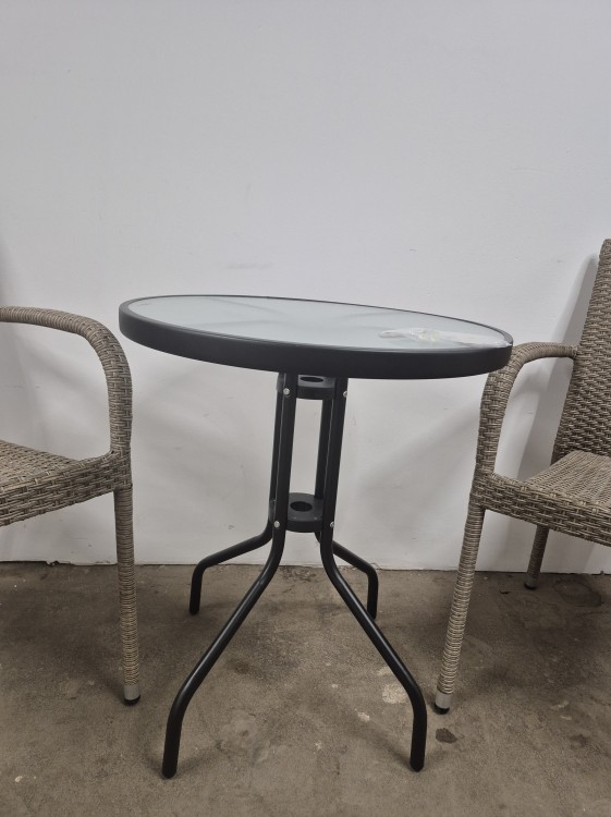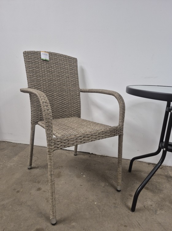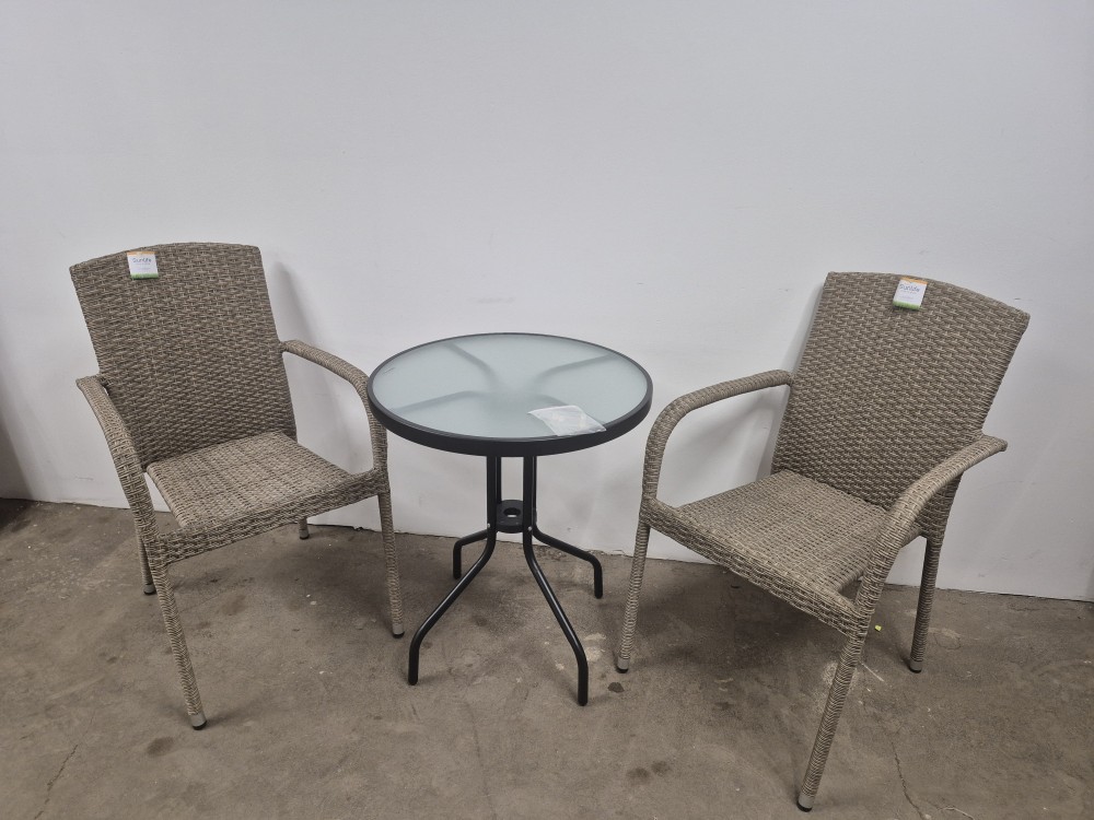 Elegantiškas ir kompaktiškas lauko baldų komplektas, sudarytas iš dviejų pintų kėdžių ir apvalaus stiklinio staliuko. Kėdės pagamintos iš patvaraus, oro sąlygoms atsparaus dirbtinio ratano, kuris ne tik atrodo natūraliai, bet ir yra lengvai prižiūrimas. Tvirtas metalinis rėmas užtikrina stabilumą ir ilgaamžiškumą.